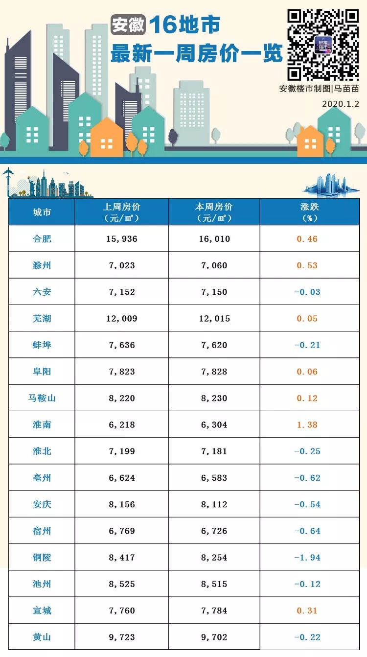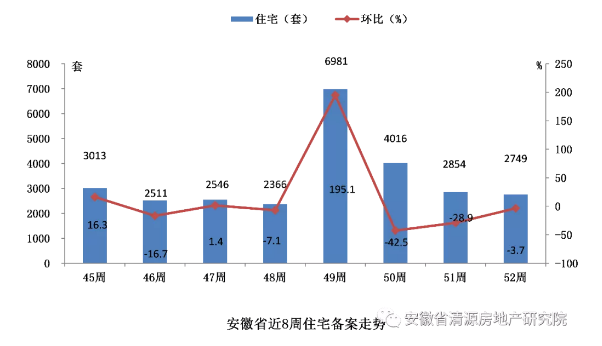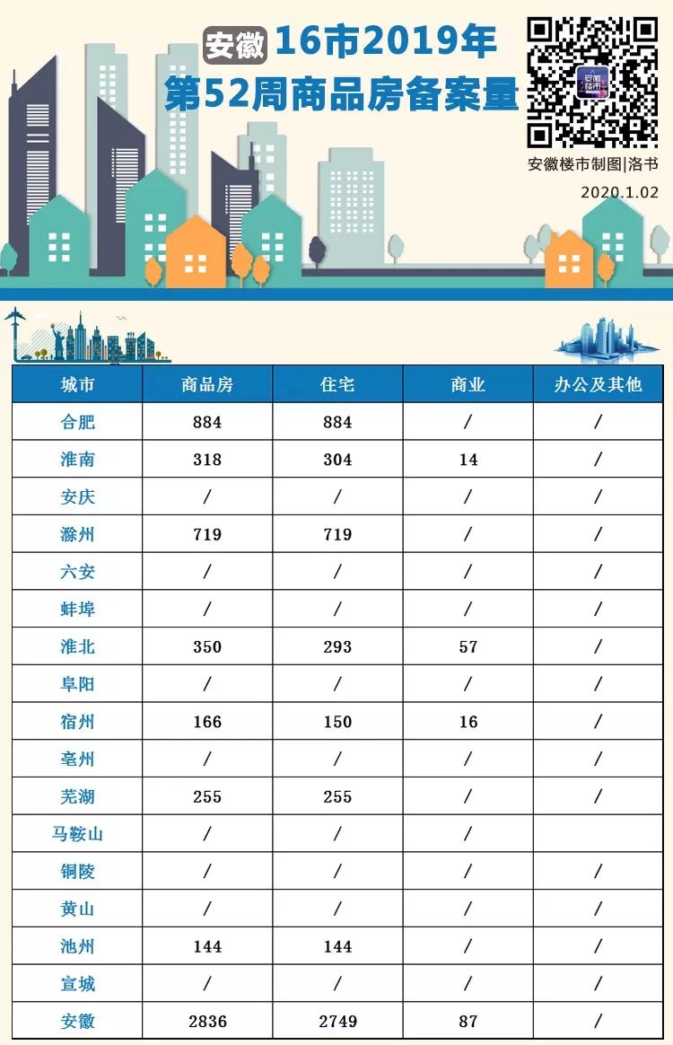导读:一周安徽 (12月23日-12月29日) 一文知晓安徽16个城市的有关房地产、政策、大型城建等各个领域的市情与世象,足不出户阅览安徽大城小事。 安徽省16个地市最新一周房价一览 1、本周在样本16城... 一周安徽 (12月23日-12月29日) 一文知晓安徽16个城市的有关房地产、政策、大型城建等各个领域的市情与世象,足不出户阅览安徽大城小事。 安徽省16个地市最新一周房价一览 1、本周在样本16城中,7城房价出现上涨,上涨的城市包括合肥、滁州、芜湖、阜阳、马鞍山、淮南、宣城,其中最大涨幅城市为淮南,上涨86元/㎡,涨幅为1.38%。 2、数据显示,本周9城房价出现下跌。在下跌的几个城市中,下跌幅度最大的城市为铜陵,跌幅为1.94%。 3、从上方图表中可以看出,16个城市7 涨9跌。 安徽省16地市最新房价柱状图 安徽省16地市最新一周房价图 安徽一周房产销售情况 2019年第52周期间(2019. 11.23-2019.12.29),全省商品房累计备案套数2836套(不包含安庆市、铜陵市、六安市、宣城市、蚌埠市、马鞍山市、阜阳市、黄山市、亳州市的数据),环比减少160套,降幅5.3%。其中商品住宅备案2749套,环比减少105套,降幅3.7%;商业备案87套,环比减少55套,降幅38.7%;办公及其他本周期间无备案数据。 本周期间全省商品住宅备案量环比小幅下跌,各地市备案情况为5跌2升,其中淮南、滁州市的住宅备案量呈上涨,而淮北、合肥、池州、芜湖和宿州市的住宅备案量均呈现不同幅度下跌。 从成交结构来看,安徽省第52周住宅备案量为2749,占比96.9%,商业备案量为87套,占比3.1%,办公及其他本周期间无备案。 本周商品住宅备案量最多的城市为合肥市,其备案量为884套,排名第二的为滁州市,住宅备案量为719套,淮南市排名第三,住宅备案量为304套,其余地市住宅备案量均低于300套。本周安徽省的住宅备案量环比小幅下跌。 第52周期间,仅皖中的住宅备案量均小幅上涨,而皖北和皖南的住宅备案量均呈现下跌,使得全省商品住宅备案量环比持续下跌。