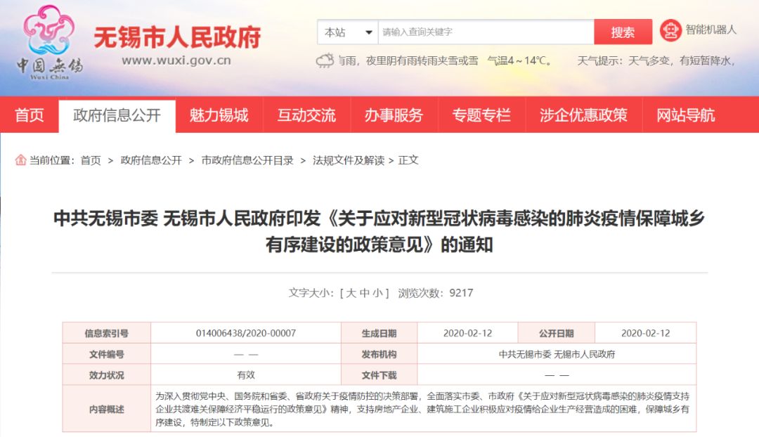 导读:刚刚!天津发布新政:延期缴纳土地出让金,项目开竣工期限顺延。 12日晚间,无锡、西安、深圳等多个城市连夜出台新政救市!救市手段包括放宽公积金政策、放松预售条件,分期交土地出让金等三大方面。 政策之宽前... 刚刚!天津发布新政:延期缴纳土地出让金,项目开竣工期限顺延。 12日晚间,无锡、西安、深圳等多个城市连夜出台新政救市!救市手段包括放宽公积金政策、放松预售条件,分期交土地出让金等三大方面。 政策之宽前所未有,预计未来还会有更多城市跟进救市。 天津 延期缴纳土地出让金 2月13日,天津市规划和自然资源局发布《天津市规划和自然资源局落实天津市打赢新冠肺炎疫情防控阻击战进一步促进经济社会发展若干措施实施细则》(以下简称《细则》),其中多项涉及房地产,内容包括疫情期间项目规划用地审批、政务服务、土地使用、不动产登记等。 其中,有几个重点: 1、延期缴纳土地出让金。 对已签订土地出让合同或在此期间新取得建设用地使用权的企业,可自动延期缴纳土地出让金,延期期间不产生滞纳金(或违约金)。 2、项目开竣工期限顺延。自2020年1月24日启动天津市重大突发公共卫生事件一级响应以来,对已供应的建设项目用地,建设用地使用权出让合同或划拨决定书约定、规定的开、竣工期限自动顺延,建设用地使用权人无需另行申请开、竣工延期,疫情持续期间不计入违约期。 3、推行不动产登记不见面办理。 自2020年2月12日起,除在建工程抵押登记以外的其他抵押登记业务,均可在与我局合作的34家金融机构,通过“不动产登记一网通”系统,实现网上不见面办理,并不断扩大与金融机构合作范围。 2020年2月20日起,上线运行天津市不动产登记APP,实现变更登记、转移登记等网上申请、网上预审、网上咨询、网上查询等功能,并逐步覆盖各类登记业务。 4、简化登记流程。 自2020年2月10日起,为缓解疫情防控期间企业融资压力,为企业申请在建工程抵押登记开辟绿色通道,合并、优化登记环节,采取查看现场时一并受理登记的方式,确保24小时内办结。同时,对于紧急登记事项,通过预约等方式定时定点提速办理,满足申请人的登记需求。 无锡 申请预售门槛调整助力房企促成交 2月12日深夜,江苏省无锡市政府在官网发布《关于应对新型冠状病毒感染的肺炎疫情保障城乡有序建设的政策意见》。 《意见》共计17条,旨在支持房地产企业、建筑施工企业积极应对疫情给企业生产经营造成的困难,保障城乡有序建设。 其中,重点内容如下: 1、受疫情影响办理纳税申报困难的企房企,缴纳税款最长可延期3个月。 2、受疫情影响缴纳房产税、城镇土地使用税确有困难的,可申请减免。 3、长租公寓企业,可申请服务业企业纾困专项资金补助。 4、对受疫情影响严重、到期还款困难的企业可予以展期。 5、对2020年6月30日前到期、贷款期限在一年以内的贷款落实无还本续贷。 6、对正常执行资金监管办法的企业批准其可跨一个节点申请提前拨付重点监管资金。 7、预售部分完成25%以上投资的,可申请预售。 8、企业可申请延迟交地和延期缴纳出让金。 9、受疫情影响的开发项目,城市基础设施配套费可延期缴纳。 10、不能按期开竣工的,开竣工时间相应顺延。 11、对租赁房屋属于国有资产的中小企业,免收1至3个月租金。 全文如下:滑动可看 为深入贯彻党中央、国务院和省委、省政府关于疫情防控的决策部署,全面落实市委、市政府《关于应对新型冠状病毒感染的肺炎疫情支持企业共渡难关保障经济平稳运行的政策意见》精神,支持房地产企业、建筑施工企业积极应对疫情给企业生产经营造成的困难,保障城乡有序建设,特制定以下政策意见。 一、受疫情影响办理纳税申报困难的房地产开发企业、建筑业企业、房屋中介企业、房屋租赁企业,由企业申请,依法办理延期申报。 对确有特殊困难而不能按期缴纳税款的,由企业申请,依法办理延期缴纳税款,最长不超过3个月。 至疫情结束,受疫情影响缴纳房产税、城镇土地使用税确有困难的,可申请房产税、城镇土地使用税困难减免。受疫情影响导致重大损失、亏损严重的长租公寓企业,可申请服务业企业纾困专项资金补助。(责任单位:市税务局、市财政局、市发展改革委) 二、引导在锡银行机构保持房地产和建筑施工企业信贷合理适度增长,不得盲目抽贷、断贷、压贷,缓解企业流动性困难。采取有力措施帮助房地产和建筑施工企业渡过防疫困难期,保障我市实施疫情防控一级响应措施期间个人住房贷款的有序投放; 对受疫情影响严重、到期还款困难的企业可予以展期,对2020年6月30日前到期、贷款期限在一年以内的贷款落实无还本续贷,并依调整后的还款安排报送信用记录。 (责任单位:人民银行无锡市中心支行、无锡银保监分局、市地方金融监管局、市公积金中心) 三、已经领取施工许可证范围内的楼栋,因疫情影响施工建设的,预售资金监管主管部门可依企业申请,对正常执行资金监管办法的企业批准其可跨一个节点申请提前拨付重点监管资金。 完成不动产首次登记前,累计申请使用额度不超过重点入账监管资金的95%。 (责任单位:市住房城乡建设局) 四、已经领取施工许可证范围内的楼栋,因疫情影响施工建设的,申请预售时原形象进度要求调整为按投资额计算,预售部分完成25%以