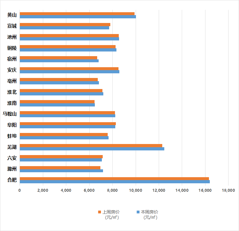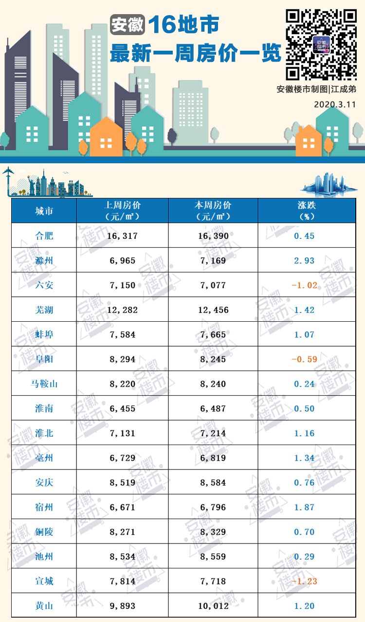 2、数据显示,本周3城房价出现下跌。其中下跌城市为六安、阜阳、宣城,下跌幅度最大的城市为宣城,下跌了96元/㎡,跌幅为1.23%。