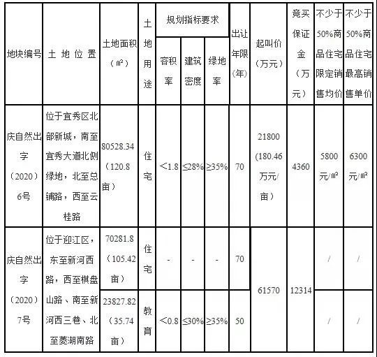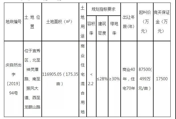 备注:庆自然出字〔2019〕94号地块规划用地性质为商业居住混合用地,其中住宅计容建筑面积(含住宅配套设施)占总计容建筑面积比例≤89%,商业、商务计容建筑面积(含商业、商务配套设施)占总计容建筑面积比例≥11%。