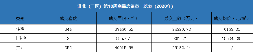 2020年第10周淮南住宅成交178套,环比上周(2020年第9周)增加3套,上涨1.71%;环比上周成交面积增加989.62㎡,上涨4.94%;环比上周成交均价增加793.83元/㎡,上涨13.87%;环比成交总额增加2234.42万元,上涨19.5%。 从10周的成交数据中看出,淮南楼市基本处于稳中有升阶段,受新冠疫情的影响,楼市成交都有所下降,但从2月底开始,房企陆续复工,逐渐开始回温,但相对升温速度较为缓慢,环比上周来看基本变动幅度不大,但成交价格的幅度速度相对较快。 淮 北 1淮北市三区住宅销售344套 据不完全统计,2020年第10周(2020.3.2-2020.3.8),淮北市三区(相山区、杜集区、烈山区)住宅销售344套,非住宅销售8套;住宅成交均价6163.31元/㎡,非住宅成交均价15524.29元/㎡。 亳 州 1【魏武大道桥至京九铁路】将新增九处景点 目前亳州市河道综合治理涡河城区段方案设计正在公示。