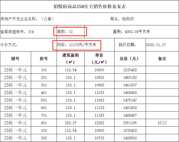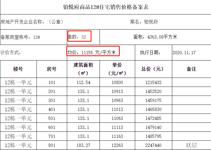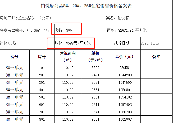 铂悦府此次备案了8#、20#、26#,共计306套房源,备案均价9588元/㎡。