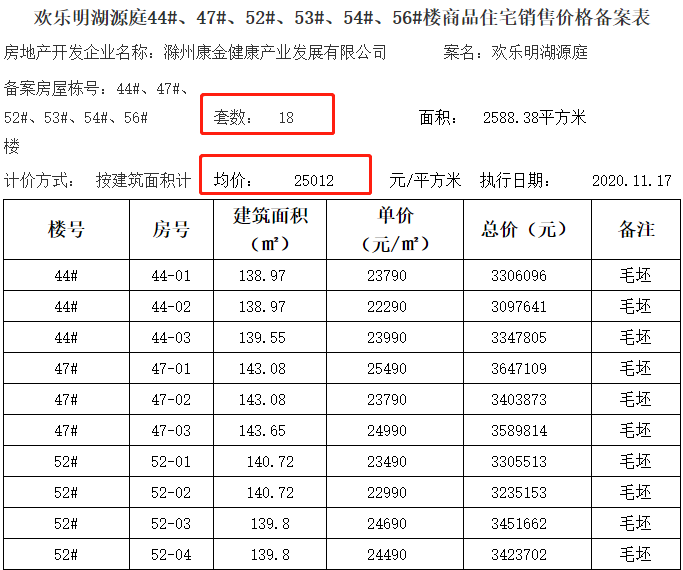 欢乐明湖源庭此次备案了44#、47#、52#、53#、54#、56#,共计18套房源,备案均价25012元/㎡。