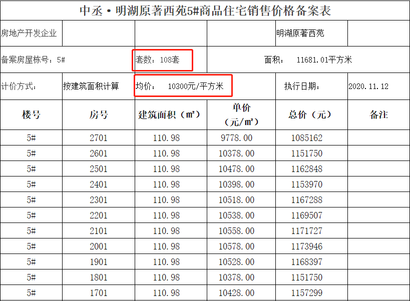 中丞明湖原著西苑此次备案了5#,共计108套房源,备案均价10300元/㎡。
