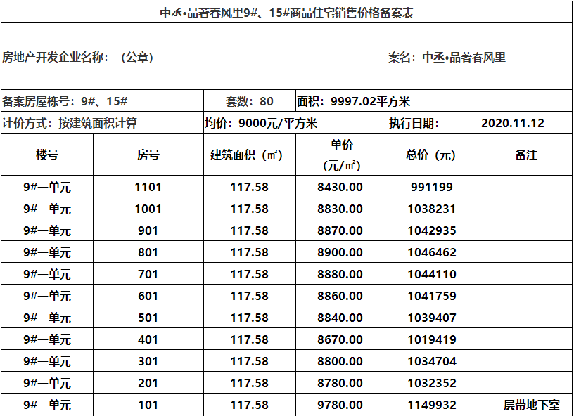 中丞品著春风里此次备案了9#、15#,共计80套房源,备案均价9000元/㎡。