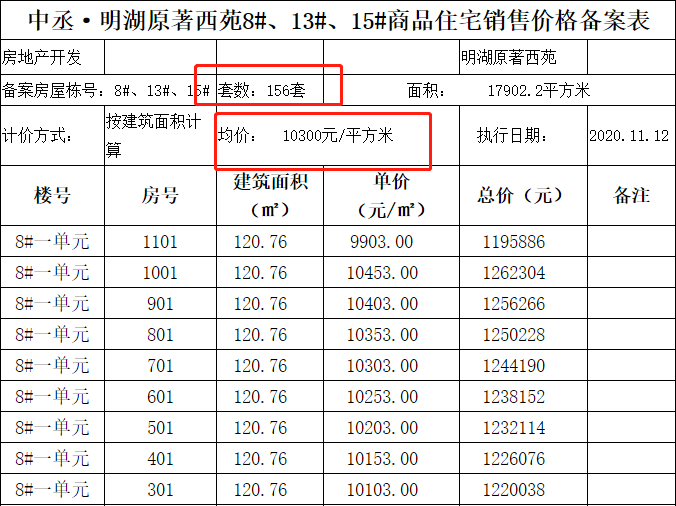 以及8#、13#、15#,共计房源156套,备案均价10300元/㎡。