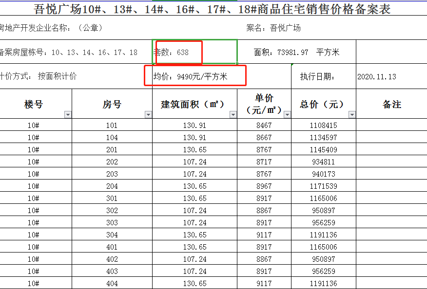 吾悦广场此次备案了10#、13#、14#、16#、17#、18#,共计638套房源,备案均价9490元/㎡。