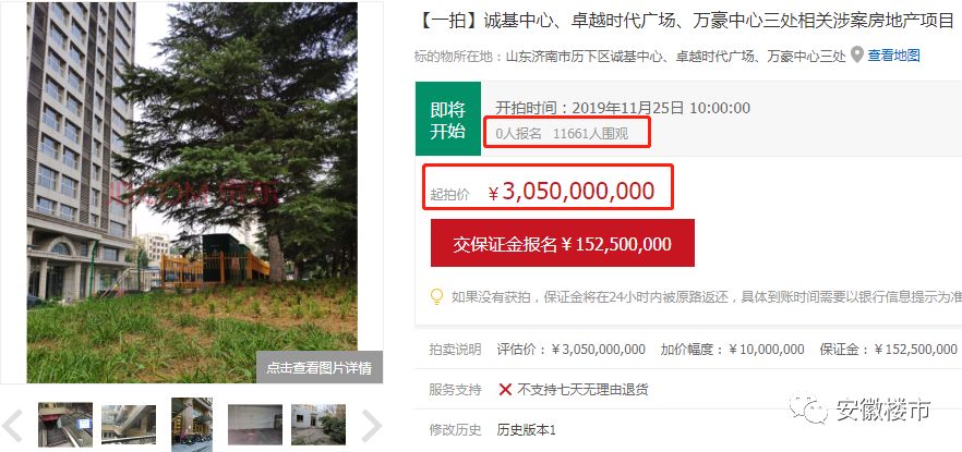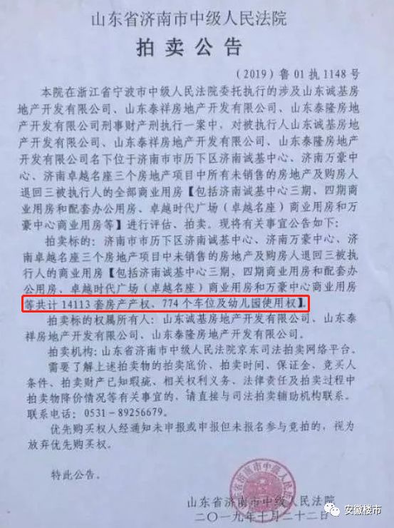 导读:震惊全国! 地产房企老板被抓 项目1.4万套房子被法院拍卖 起拍价达到30.5亿元 业主退房!地块收回! 楼市大洗牌开始了! 起拍价30亿!房企1.4万套房子被拍卖 近日,一则人民法院发布的拍卖公告震... 震惊全国! 地产房企老板被抓 项目1.4万套房子被法院拍卖 起拍价达到30.5亿元 业主退房!地块收回! 楼市大洗牌开始了! 起拍价30亿!房企1.4万套房子被拍卖 近日,一则人民法院发布的拍卖公告震惊全国!其中,14113套房子将被司法拍卖! 在公告中可以看到,由于3家公司涉及刑事财产执行一案,导致3家楼盘诚基中心、卓越时代广场、万豪广场共14113套房产产权的使用权被法院进行拍卖! 1 1.4万套房起拍价达30.5亿元 据了解,本次拍卖起拍价为30.5亿元,拍卖时间为11月25日至26日,将在京东拍卖平台上进行拍卖! 可以看到,此次拍卖的起拍价达到了30亿,也是迄今为止全国最高的一次法拍! 目前,关注这起法拍的人数已经达到了1.1万人。不过由于起拍价太高,暂无人报名! 据了解,即将被拍卖的房子,均为开发商尚未销售的楼盘和买房人退回的楼盘。 2 拍卖房源共为3家楼盘 此次的拍卖中共有3家楼盘,分别是诚基中心、卓越时代广场、万豪广场! 诚基中心:1.18万套房被拍卖 其中,“鼎鼎大名”的诚基中心占了大头,共有1.18万套房子要拍卖,建筑面积共有15.53万平方米,评估总价23.09亿元。 从买卖信息中我们就能看到,诚基中心曾经的疯狂:这次被拍卖的房屋,平均每套面积仅有13.1平方米。 同时,本次拍卖房屋中大部分均为商业和配套办公。其中,商业共有7889套,面积98982平方米,每套面积为12.5平方米。 据了解,这些商铺的公摊比例非常高,可达到一半以上。使用面积平均可能只有5-6㎡!绝对的小迷你商铺!这是该项目被疯狂吐槽的原因之一。 卓越时代广场:941套房被拍卖 除了诚基中心,卓越时代广场有941套房屋将被拍卖,平均每套面积为21.17平方米,主要为公寓和商业产品。 卓越时代广场的建筑密度非常大,站在公寓中间的小广场往上看,只能看到“一线天”。 万豪广场:1349套房被拍卖 另外,万豪广场也有一千多套房子拍卖,包括1349套商业产品,总面积2.33万平方米,单套面积平均为17.3平方米。同时,项目幼儿园建筑也将被拍卖。 3 三处楼盘的入住率都很高 坦白地说,无论是诚基中心,还是万豪广场,还是卓越时代广场,位置都是非常好的,绝对是黄金地段。 有人说,在济南最好的地段上,做出了最烂的产品!简直是糟蹋土地! 不过,凭借着稀缺的位置,这三处楼盘的入住率都很高。 诚基中心、万豪广场不用说,简直已经是外来人口聚集地,而且还有很多老外在那里住。曾经几乎要烂尾的卓越时代广场,现在的入住率也很高,到了晚上开灯率很高。 老板被抓!业主退房!地块收回! 说起被拍卖的这3家项目,其实老板为同一个人!不过随着老板被抓之后,所有工程都停滞了。 随后,3000多名业主曾多次发起大规模聚集事件!卓越时代广场的工程便断断续续的干着。 据了解,该房企在济南的“操盘”颇有特点: