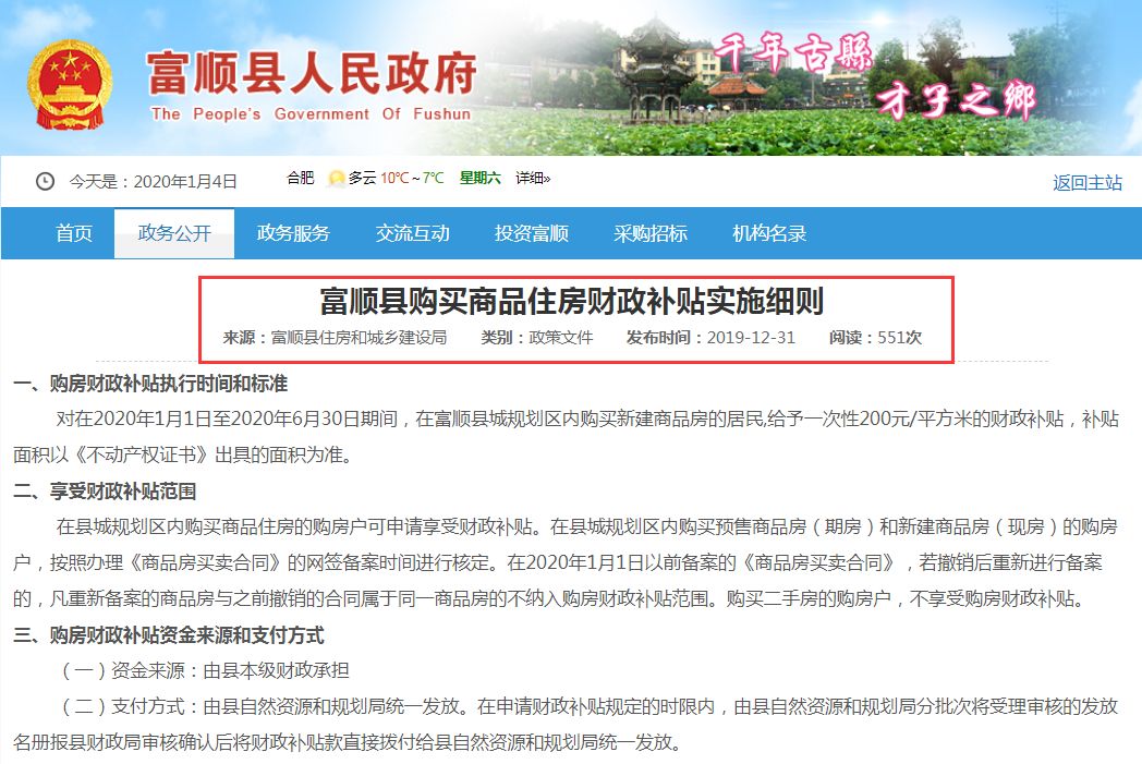导读:2020地产“第一枪”打响! 买新房就送补贴礼包 一次性支付200元/㎡的财政补贴! 放宽人才落户,固安人才购房政策引躁动! 广州单套人才公寓 高层次人才可免租金入住! 救市大... 2020地产“第一枪”打响! 买新房就送补贴礼包 一次性支付200元/㎡的财政补贴! 放宽人才落户,固安人才购房政策引躁动! 广州单套人才公寓 高层次人才可免租金入住! 救市大招来了,2020房价要涨了吗? 2020年救市信号! 四川富顺县买房“送钱”! 2020年1月2日,四川自贡市富顺县发布了《富顺县购买商品住房财政补贴实施细则》的通知。