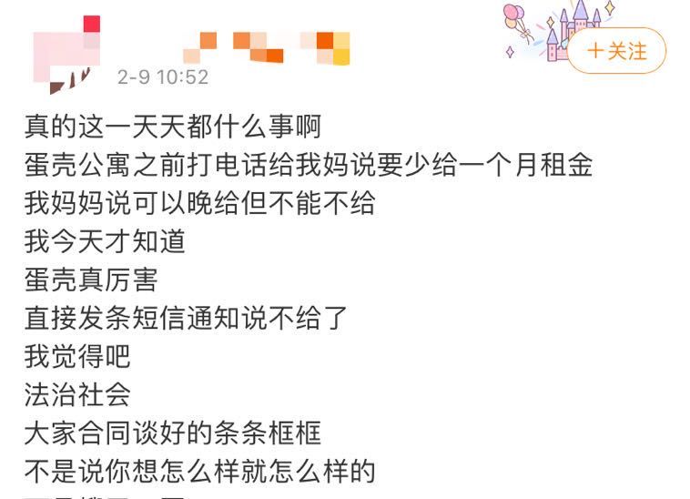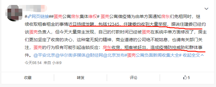随后,有不少房东接到了蛋壳公寓官方打来的电话: 蛋壳公寓的这番做法引起大批房东不满:“我的房子,凭什么由你来决定要不要减免房租?”“你替我免租金,谁替我还房贷?”“拿房东的钱往自己脸上贴金!”