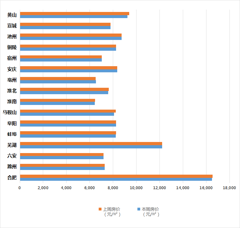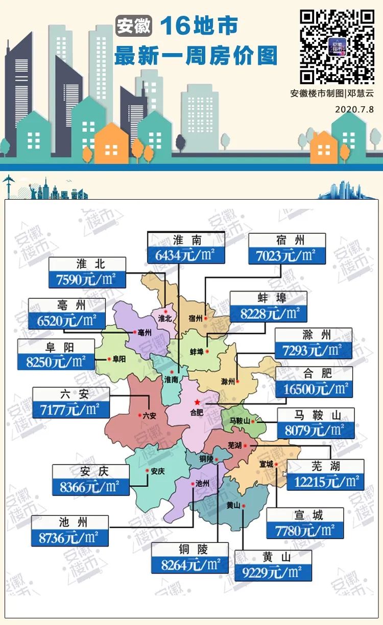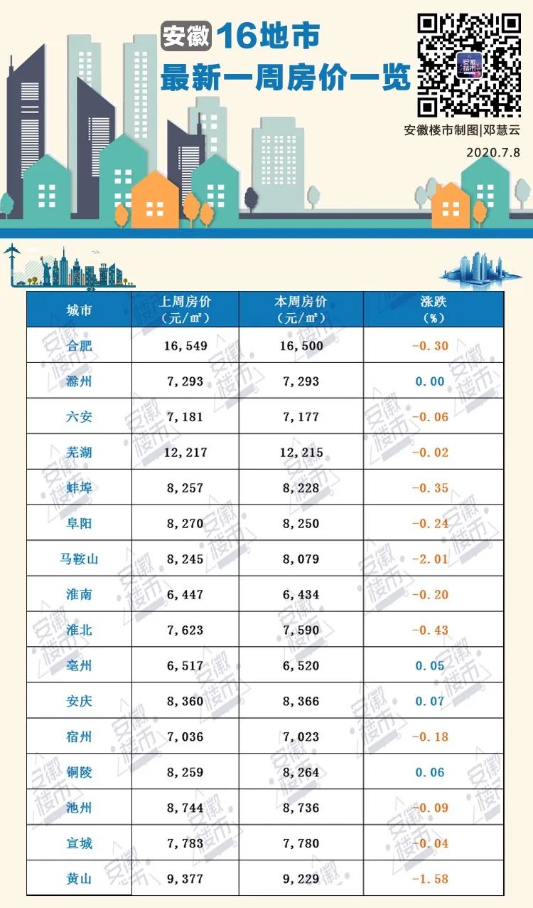 导读:一周安徽(6月29日-7月5日)一文知晓安徽16个城市的有关房地产、政策、大型城建等各个领域的市情与世象,足不出户阅览安徽大城小事。安徽省16个地市最新一周房价一览1、本周在样本16城中,仅有3城房价... 一周安徽(6月29日-7月5日) 一文知晓安徽16个城市的有关房地产、政策、大型城建等各个领域的市情与世象,足不出户阅览安徽大城小事。 安徽省16个地市最新一周房价一览 1、本周在样本16城中,仅有3城房价出现上涨,亳州、安庆、铜陵,其中上涨的幅度也非常小,最高的是安庆,仅上涨6元/㎡,涨幅为0.07%。 2、数据显示,本周12城房价出现下跌。其中下跌城市为合肥、六安、芜湖、蚌埠、阜阳、马鞍山、淮南、淮北、宿州、池州、宣城、黄山,下跌幅度最大的城市为黄山,下跌了148元/㎡,跌幅为1.58%。 3、此外,还有一城保持平稳状态,滁州本周房价依旧是7293元/㎡。 4、从上方图表中可以看出,16个城市12跌3涨1持平。 安徽省16地市最新房价柱状图 安徽省16地市最新一周房价图 合 肥 1公开招标!合肥7条地铁又有新进展 据安徽公共资源交由中心消息,合肥市轨道交通2号线延长线、3号线延长线、4号线延长线、6号线一期、7号线一期、8号线一期及S1线工程保险经纪服务公开招标!