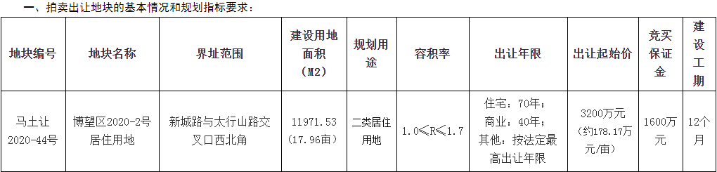 地块编号:马土让2020-44号 地块名称:博望区2020-2号居住用地 界址范围:新城路与太行山路交叉口西北角 建设用地(面积(㎡)):11971.53(17.96亩) 规划用途:二类居住用地 容积率:1.0≤R≤1.7 出让年限:住宅:70年;商业:40年;其他:按法定最高出让年限 出让起始价:3200万元(约178.17万元/亩) 竞买保证金:1600万元 建设工期:12个月 亳 州 1亳州市区这7条道路将增设人行道… 近日,亳州市区紫苑路等7条道路人行道工程,施工项目前期工作基本完成,即将进场施工。 紫苑路(宋汤河路至仙翁路段)杜仲路(龙凤新河至110千伏杜仲变电站段,外经钻石广场南门至希夷大道段,市人民医院北门至京皖财富中心段)漆园路(牡丹路至养生大道段)亳菊路(宋汤河路至仙翁路段)牡丹路(宋汤河路至仙翁路段)银杏路(宋汤河路至汤王大道段)汤王大道(银杏路至酒城大道段,含亳菊路北西侧200米)。