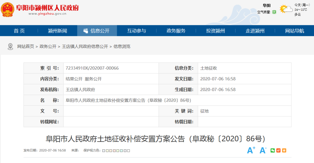 具体公告如下:阜阳市人民政府土地征收补偿安置方案公告(阜政秘〔2020〕86号) 一、征收范围阜阳市颍州区颍西街道河水社区、魏庄社区,具体范围以勘测定界图为准。 二、土地现状征收土地面积24.9462公顷,地类为农用地24.9462公顷(含耕地24.3676公顷,其他农用地0.5786公顷)。 三、征收目的本次拟征收土地用于阜阳市信息工程学院项目建设及配套周边路网建设,符合法律规定的可以征收情形。 四、补偿标准根据《安徽省自然资源厅关于按照新修正〈土地管理法〉实施建设用地审查报批有关工作的通知》(皖自然资〔2020〕70号),土地补偿费和安置补助费标准待省政府区片综合地价颁布实施后执行,其他地上附着物补偿标准待市政府新标准颁布实施后执行。 五、安置方式与社会保障 采取货币安置和养老保险安置相结合的办法,符合《阜阳市人民政府办公室关于印发阜阳市被征地农民基本养老保险办法的通知》(阜办发〔2009〕45号)有关规定的被征地农民,依法办理养老保险。 淮 南 1淮南市增开旅客列车18对! 据中国铁路上海局集团有限公司淮南西站消息:2020年7月1日零时起,全国铁路将实施新的列车运行图。 这次调图,受合杭高铁合肥至湖州段、通沪铁路两条新线相继开通运营的利好影响,淮南西站管内淮南南站、淮南东站的通达能力显著提升,列车开行方向更多。 据了解,此次调图后淮南南站增开高铁列车17.5对,另取消办客列车7.5对,延长运行区间列车7对。首次增加了芜湖方向高铁列车,另外增加了温州、杭州、上海、西安方向列车开行密度。 淮南东站增开旅客列车0.5对:沈阳南—福州G1272次列车0.5对。(详细的班次列车以及线路调整信息可登陆12306官方网站) 原先黄山北—蚌埠南G7402/G7403次车次改为G7414/G7415次。 淮南站取消办客列车2.5对: 亳州—合肥K8429/30次列车1对; 阜阳—芜湖K8553/4次列车1对; 杭州—大同K892次列车0.5对。 铁路部门提醒广大旅客要及时提前做好行程安排,以免耽误出行。出现部分列车停增、区段调整、车次更改等变化要以车站公告为准,如需了解更多关于调图信息,可登陆12306官方网站或者拨打12306客服电话查询。 淮 北 1投资15亿!这个产业基地落户淮北! 近日,在安徽省举行的第六批贯彻“六稳”重大项目集中开工现场推进会上,淮北4个重大项目参加了集中开工,其中包括总投资15亿元的淮北鹿港科技毛纺产业基地项目。 淮北鹿港科技毛纺产业基地项目位于淮北高新区,占地约522亩,总投资15亿元,项目一期计划2020年12月底建成投产。达产后产值不低于30亿元,税收不低于1.2亿元,用工2000人左右。项目建成后将进一步夯实淮北市现代纺织产业基础。 马 鞍 山 1马鞍山市又一地块公布出让信息! 7月9日,马鞍山市公共资源交易交易中心又公布一宗居住用地出让信息。