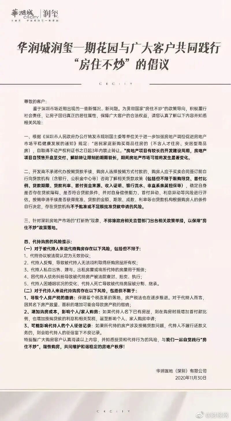 30日晚间,被央媒点名的深圳“网红”楼盘华润城润玺一期刚刚发布《与广大客户共同践行“房住不炒”的倡议》,文中称“针对深圳房地产市场的’打新热’现象,不排除政府相关监管部门出台相关政策举措,以保障“房住不炒”政策落地,并提示代持购房风险。