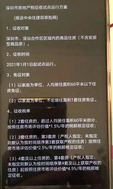 导读:近日,深圳楼市再次吸引了市场的目光。发生了两件大事。一是一则明年将征房地产税的传言让深圳业主群炸开了锅,二是近期,华润城润玺一期等热点楼盘出现“万人抢房”、“众筹打新”等情况,引起了监管部门的关注。深... 近日,深圳楼市再次吸引了市场的目光。发生了两件大事。一是一则明年将征房地产税的传言让深圳业主群炸开了锅,二是近期,华润城润玺一期等热点楼盘出现“万人抢房”、“众筹打新”等情况,引起了监管部门的关注。 深圳明年将征房地产税?市住建局:假的! 近日,一张截图传遍了深圳地产圈,不少开发商看后表示若真如此,住宅就要凉凉了,而手上拥有多套房的投资客,心里不免惊了好几把。 该消息称,深圳将自明年1月1日起试点征收房地产税,征收对象为深圳市、深汕合作区区域内的商品住房。 按照以下方案中的税收征收要求,二套以上,分别按住房市场评估价*1.5%/年、2.5%/年、4.5%/年。 而据第一财经报道,工作人员就此事表示:“外部流传的消息来源不明,我们不做任何回应,一切以我们局发布的官方消息为准。”