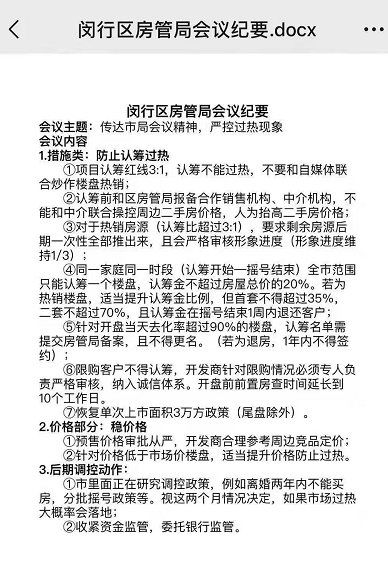 导读:进入年底,市场本该回归淡季,但最近不少城市房价的上涨,让购房者的心再次不平静,到底是怎么回事? 突发!严控过热同一家庭同时只能认筹一个盘由于楼市过热,近期上海也是传出了调控的风声。 2021年1月20... 进入年底,市场本该回归淡季,但最近不少城市房价的上涨,让购房者的心再次不平静,到底是怎么回事? 突发!严控过热 同一家庭同时只能认筹一个盘 由于楼市过热,近期上海也是传出了调控的风声。 2021年1月20日,网上传出一份《闵行区房管局会议纪要》,纪要显示因传达市局会议精神,严控过热现象,将采取一系列措施来防止新房认筹过热。