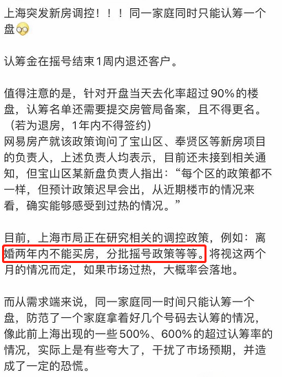 这其中就包括13个“千人摇”楼盘,人气最足的一个项目,出现了13个人抢一套房的热闹场景,而这个项目(首套)验资就得700万元,买二套房验资甚至要1300万元。 更有大V爆料,上海市局正在研究相关的调控政策,例如:离婚两年内不能买房;分批摇号政策等等。